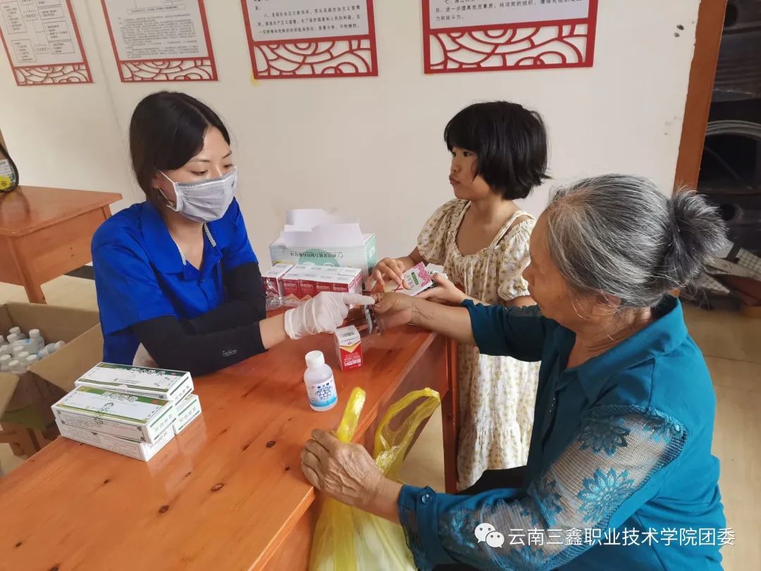 醫(yī)學(xué)專業(yè)同學(xué)為村民耐心講解藥品的使用方法、用量、功效以及注意事項(xiàng)。